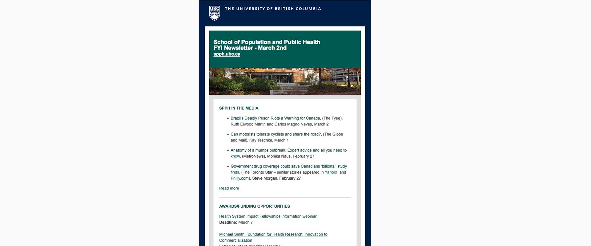 | UBC Workday – your UBC student portal to register for classes, check your grades and pay your fees. | Research Project (SPHA 590) – required 6 credit research paper and is the capstone course before graduation. | Faculty of Graduate Studies– policies and forms for program progress, leaves of absences, graduation, etc. | Aboriginal Services – dedicated resources for UBC’s Aboriginal student community. | FYI Newsletter – bi-weekly e-newsletter for the SPPH community. You are welcome to subscribe to the FYI Newsletter. |
